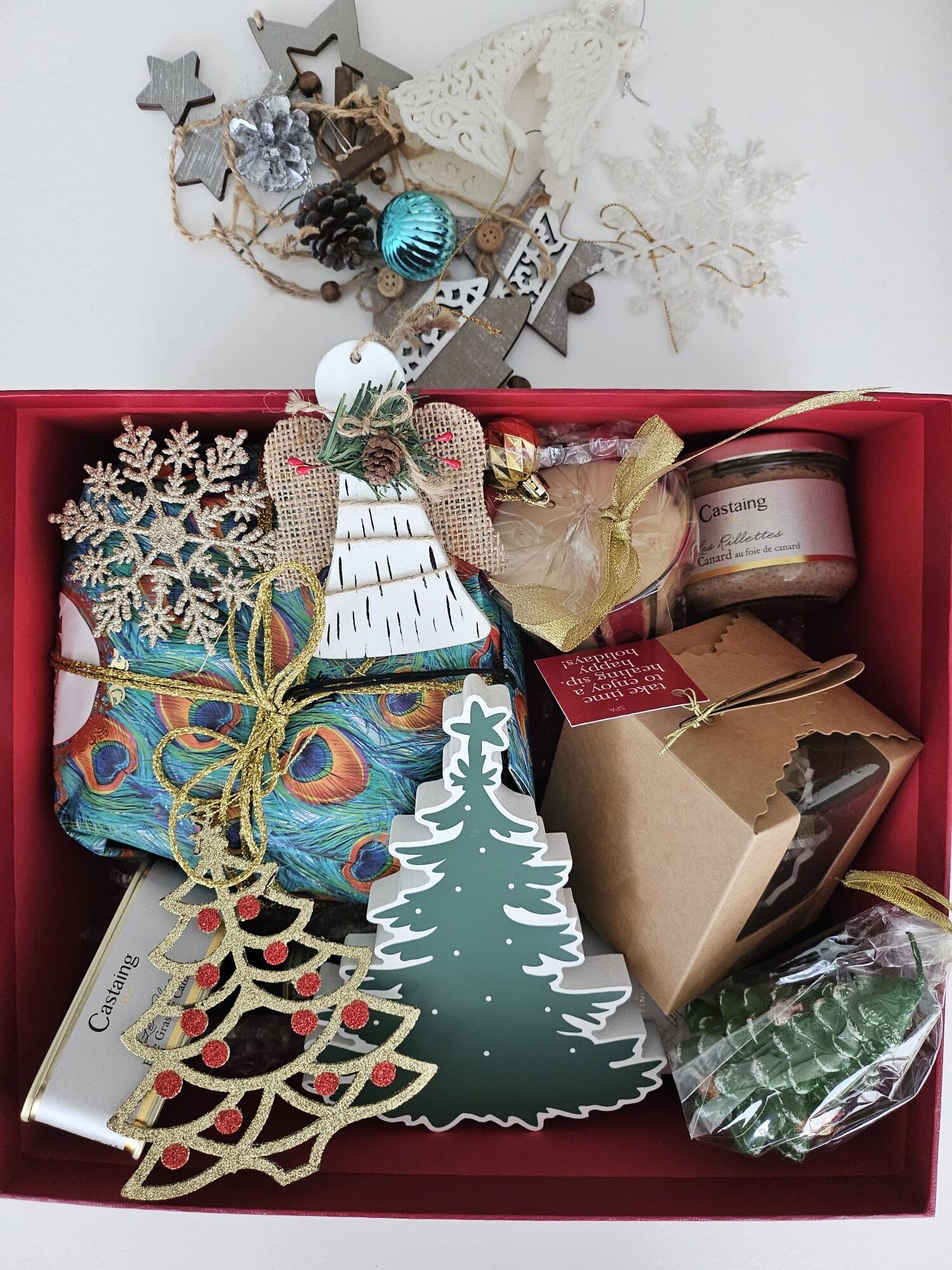 Christmas Hamper, containing panettone, Barolo wine, chocolates, spa foods, tea